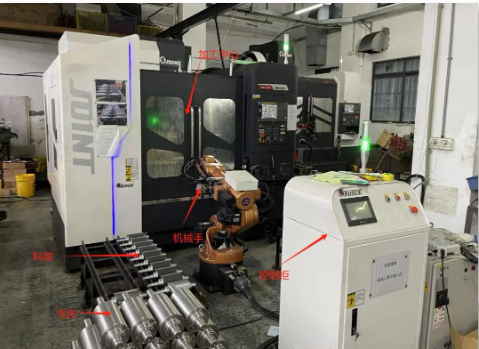 為了滿足客戶對場地有限、產(chǎn)品工序單一的需求,我們特別設(shè)計了一條一配一的自動化產(chǎn)線。這條產(chǎn)線由一臺六關(guān)節(jié)機械手和一臺加工中心組成,還配備了料架和控制電柜。整體形式簡潔明了,運行高效穩(wěn)定。