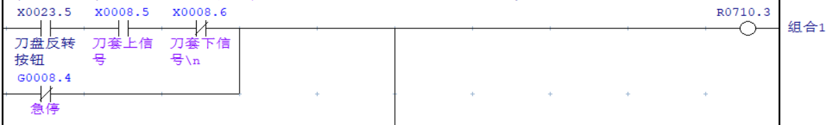 在 “模式選擇-M1”均為“1” “模式選擇-M0”均為“0”的狀態(tài)下,通過輸出“組合0”或“組合1”為“1”來試下刀盤的正反轉(zhuǎn),為避免在刀套打下的情況下轉(zhuǎn)動刀盤導(dǎo)致刀庫損壞需同時與刀套上下信號做互鎖處理。