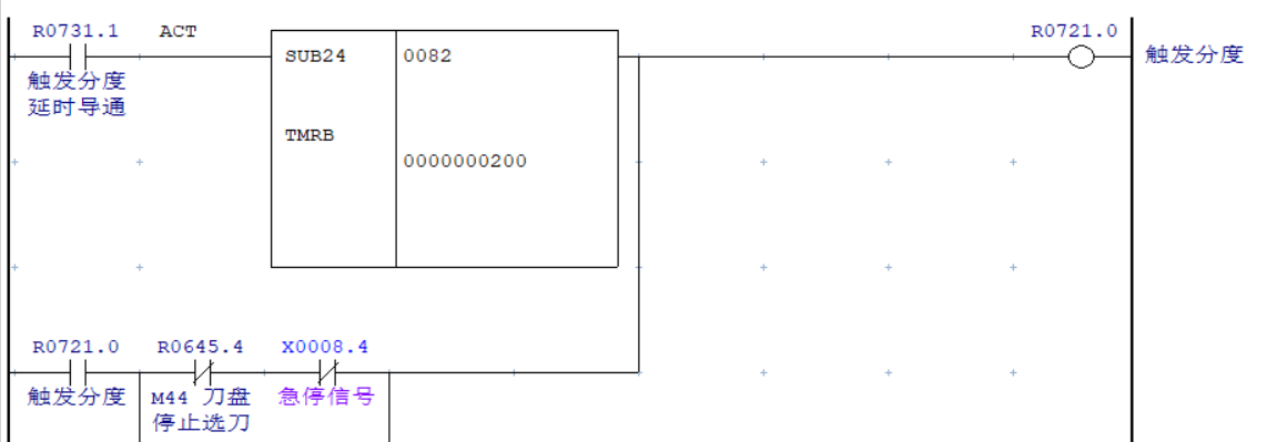 由于“自動分度模式”需在伺服驅(qū)動器在收到系統(tǒng)賦予的刀號后才能進(jìn)行尋刀切該模式需觸發(fā)0.2秒以上才能進(jìn)入,因此不能直接使用F7.3選刀信號進(jìn)行觸發(fā)而使用中間繼電器,且延遲0.2秒導(dǎo)通并進(jìn)行互鎖,確保“自動分度模式”可以正常觸發(fā)。刀盤選刀完成后導(dǎo)通SUB200功能指令進(jìn)行刀盤換刀位置刀套內(nèi)刀號與目標(biāo)刀號的比較,一致時輸出R733.4信號打斷“自動分度模式” 互鎖,完成整個選刀過程。