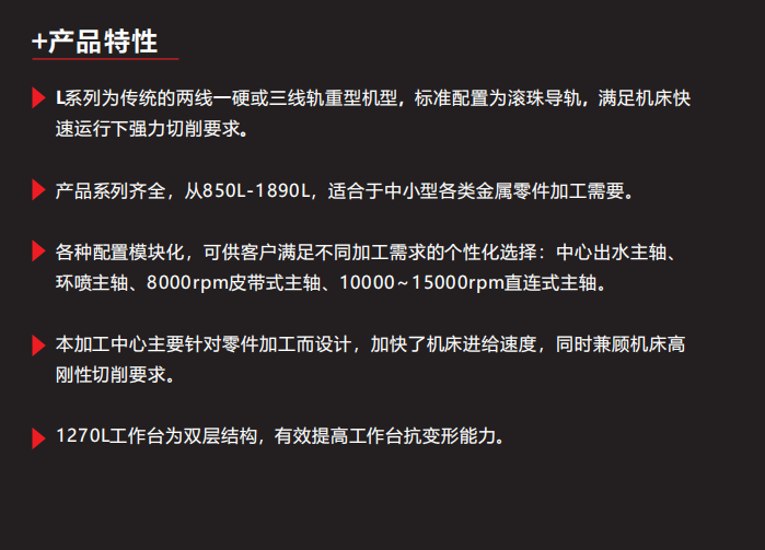 L系列整機(jī)以快速剛性加工為基本設(shè)計出發(fā)點(diǎn),為零部件量產(chǎn)、加工精度、加工效率最大化提供保證;高效排屑、快速進(jìn)給及主軸高速功能的組合模塊化,滿足客戶不同加工需求的個性化選擇;影響整機(jī)品質(zhì)的關(guān)鍵部件采用進(jìn)口優(yōu)質(zhì)配件。