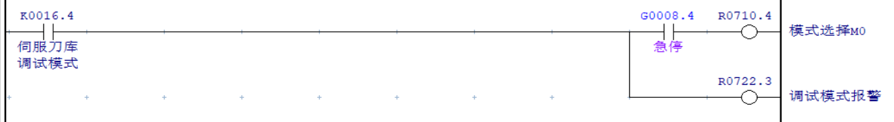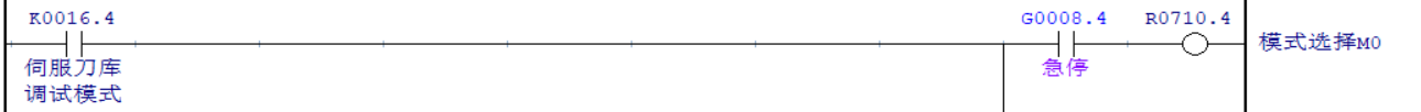 “模式選擇-M0”僅在刀庫寸動模式為“1”,該模式一般用于伺服刀庫的原點設(shè)置,屬于調(diào)試模式,機床正常使用過程無需用到該功能,因此使用K參數(shù)切換“0或1”的輸出。K參數(shù)開啟后,機床處于手動模式狀態(tài)(“模式選擇-M1”為“1”),即可激活伺服刀庫寸動模式。且進(jìn)入該模式后刀庫處于調(diào)試模式,無法正常使用,同時需輸出刀庫處于調(diào)試模式的報警提示信息。