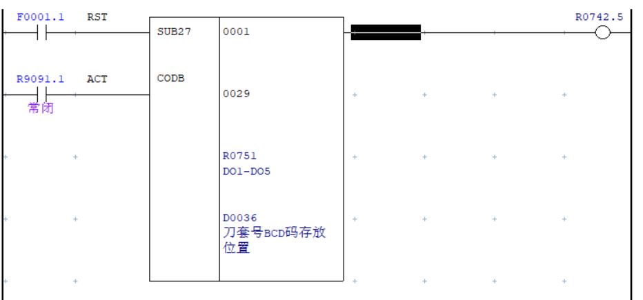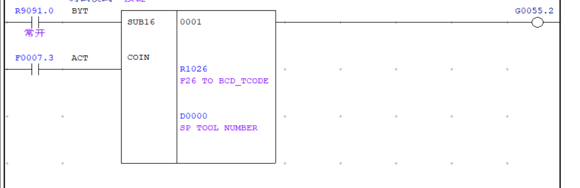 系統(tǒng)執(zhí)行T指令是觸發(fā)F7.3信號導(dǎo)通SUB16進(jìn)行目標(biāo)刀號及主軸上刀號的一致性判定,若一致時輸出G55.2為“1“停止刀號輸出,直接接受換刀動作。