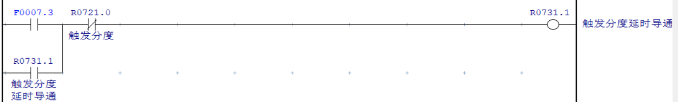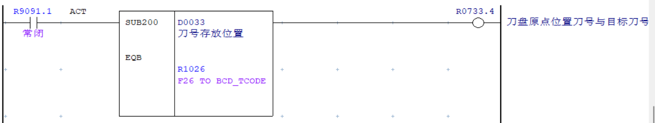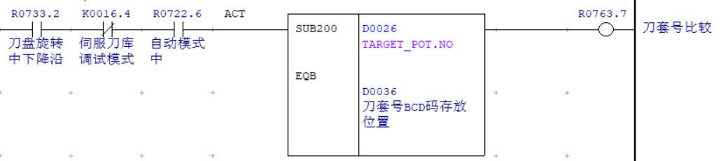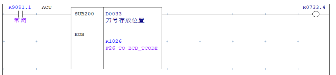 由于“自動分度模式”需在伺服驅(qū)動器在收到系統(tǒng)賦予的刀號后才能進(jìn)行尋刀切該模式需觸發(fā)0.2秒以上才能進(jìn)入,因此不能直接使用F7.3選刀信號進(jìn)行觸發(fā)而使用中間繼電器,且延遲0.2秒導(dǎo)通并進(jìn)行互鎖,確保“自動分度模式”可以正常觸發(fā)。刀盤選刀完成后導(dǎo)通SUB200功能指令進(jìn)行刀盤換刀位置刀套內(nèi)刀號與目標(biāo)刀號的比較,一致時輸出R733.4信號打斷“自動分度模式” 互鎖,完成整個選刀過程。