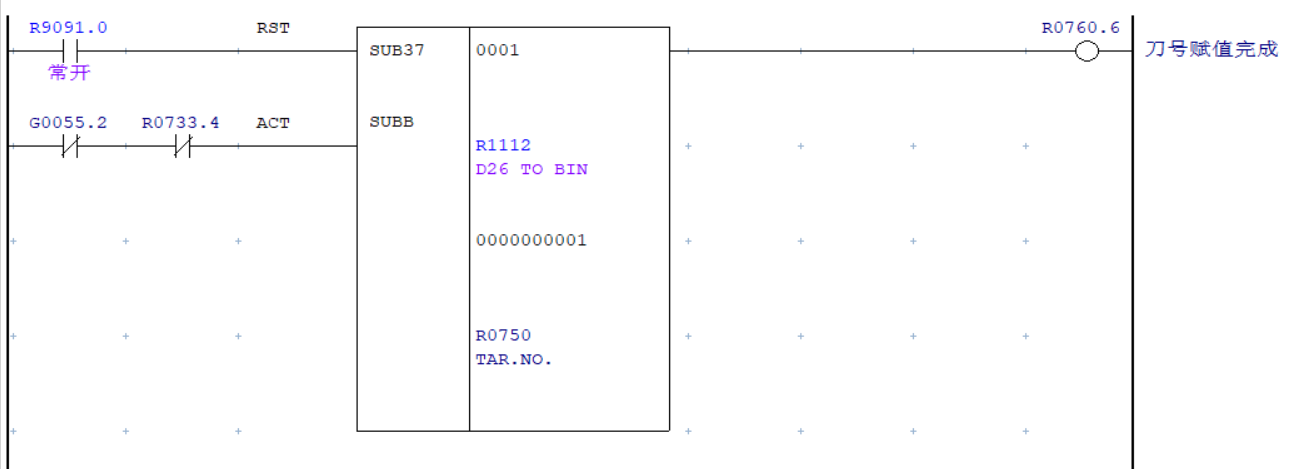注:由于該款驅(qū)動器CMD DI 組合(CMD1-CMD1均為0)即輸入0時為1號刀,而且系統(tǒng)默認(rèn)輸入1時為1號刀,因此使用SUB37(二進(jìn)制減法)功能模塊進(jìn)行刀號賦值傳輸。
