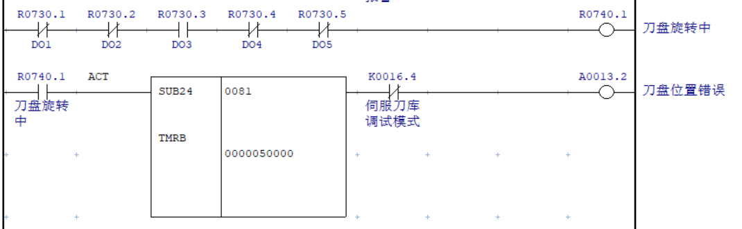 若刀盤旋轉(zhuǎn)選刀完成后刀盤位置錯誤,即出現(xiàn)DO狀態(tài)中僅DO3為“1”,其它均為0,情況下需輸出報警提示。一般情況下手動旋轉(zhuǎn)刀盤即可回正。若依然位置錯誤,使用寸動模式調(diào)整刀盤位置并重設(shè)原點也可解決。由于伺服刀庫進(jìn)行選刀時,刀盤旋轉(zhuǎn)過程中也會伺服DO狀態(tài)中僅DO3為“1”,其它均為0的情況,因此該報警需延遲觸發(fā)。